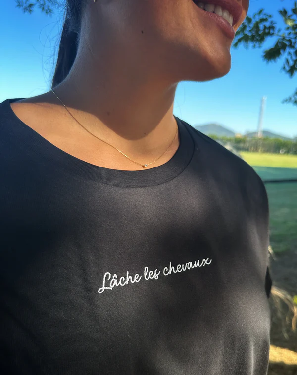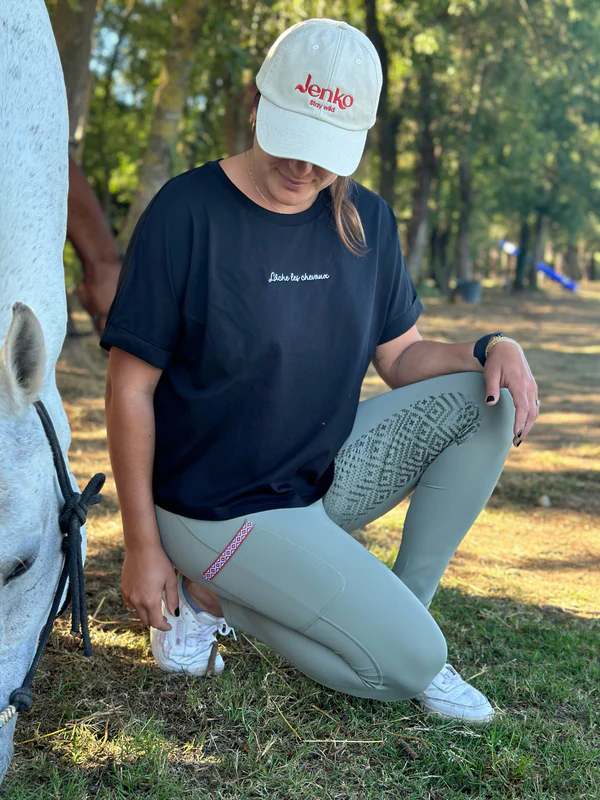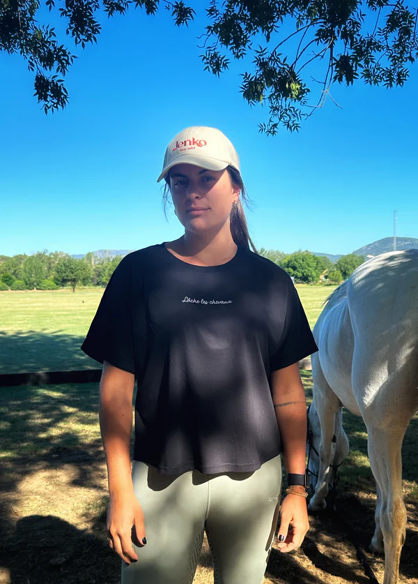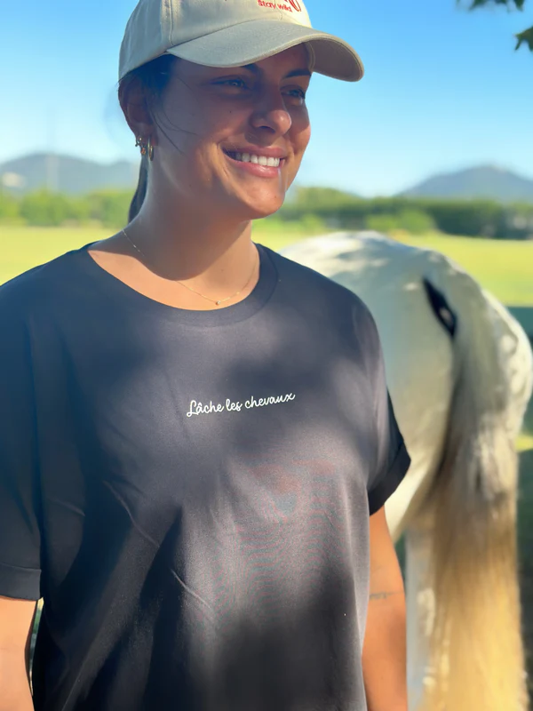 Voici un petit conseil d’ami… Lâche-toi ! Ce T-shirt en coton bio est doux et léger. Parfait pour tes séances d’équitation estivales et même pour le quotidien. Oui, il est tellement beau qu’on ne t’en voudra pas si tu le portes en dehors de l’écurie… Nous faisons de même !