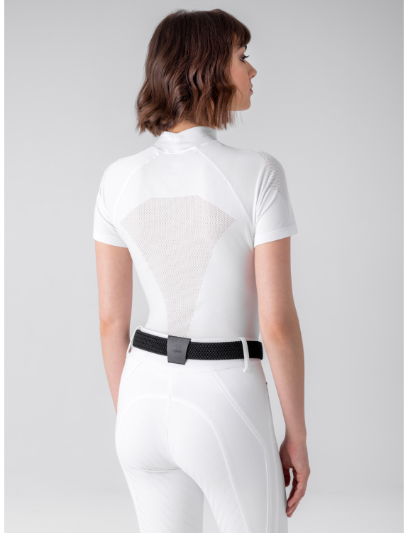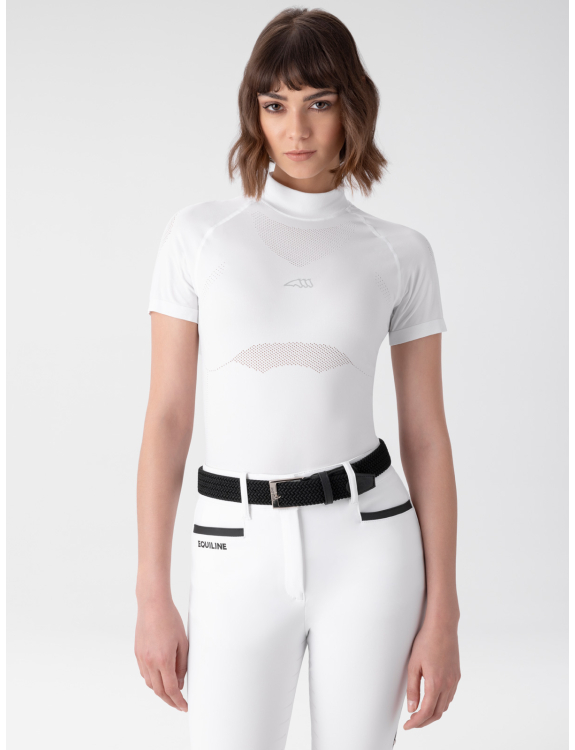 Profitez d’un confort et d’une respirabilité exceptionnels avec notre seconde peau de compétition pour femme, sans coutures. Confectionnée dans un tissu ultra-extensible, elle assure un ajustement confortable et impeccable. Le logo Equiline sur la poitrine apporte une touche de raffinement. Grâce à sa coupe ergonomique, ses détails en micro-trous et sa haute respirabilité, elle vous maintient frais et sec pendant les compétitions intenses. Bénéficiez d’un confort optimal en toutes circonstances grâce à sa capacité de séchage rapide.