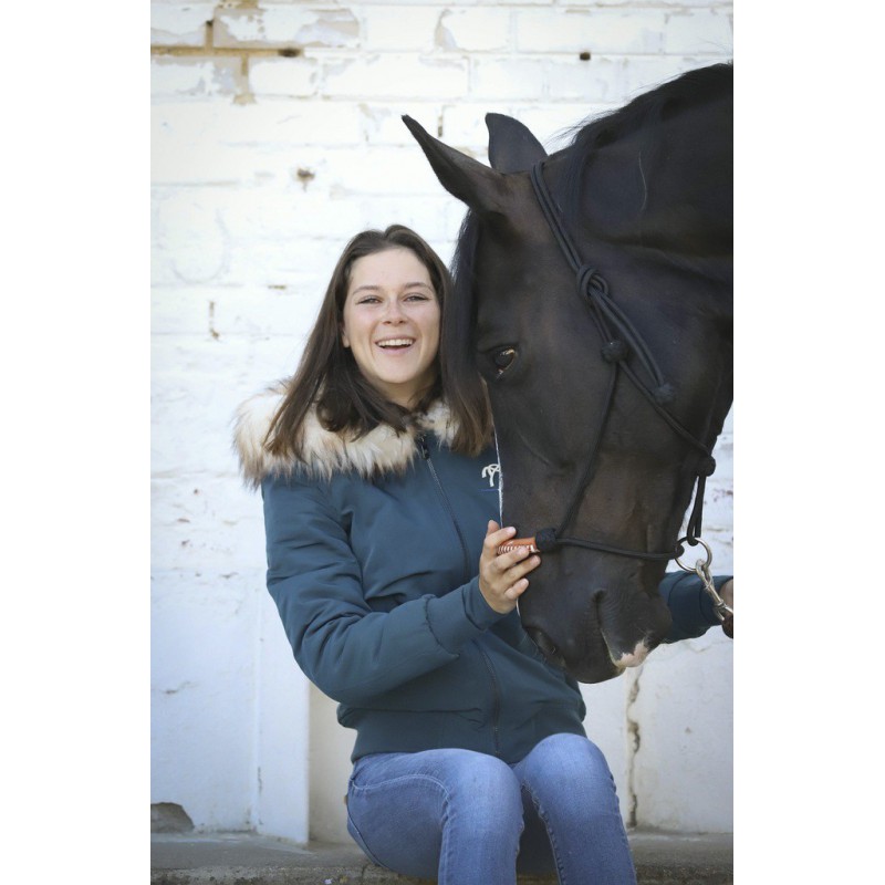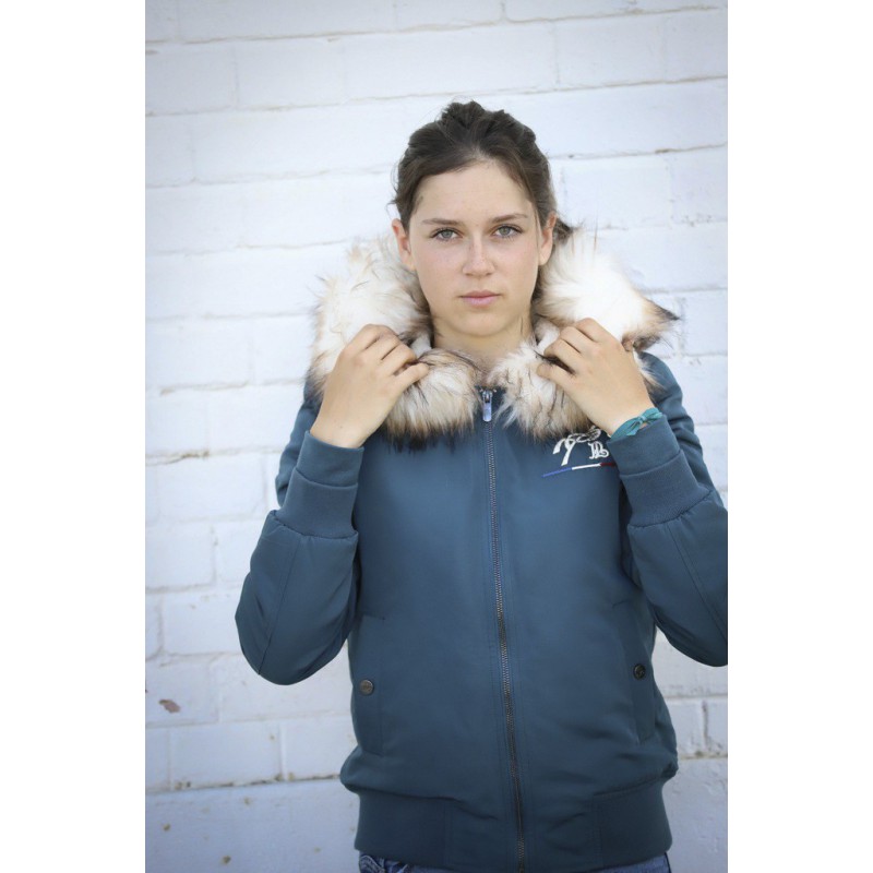 Bombers Lyon – Marine Collections Pénélope Ce blouson court type bombers est doublé d’une polaire ultra douce et doté d’une bande élastique sur le bas du blouson et les poignets. Il a une fermeture éclair centrale et deux poches sont boutonnées sur le devant. La capuche est intégrée et entourée d’une épaisse fausse fourrure. Ce blouson est déperlant mais pas imperméable.