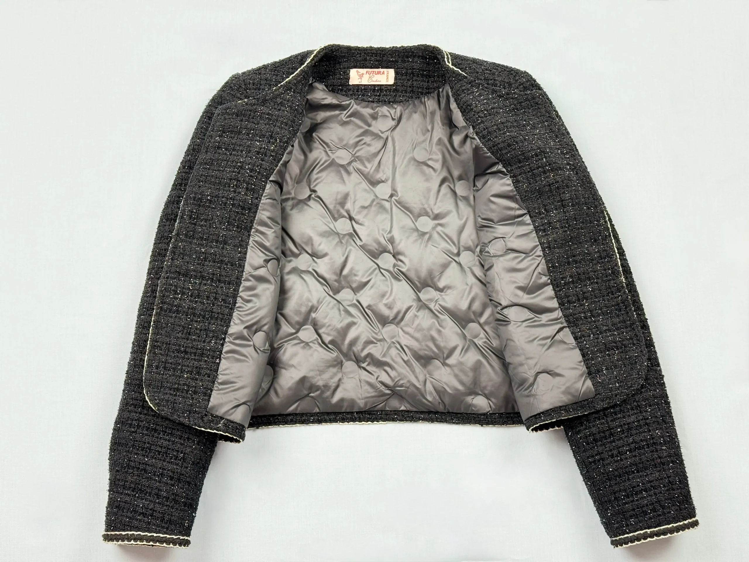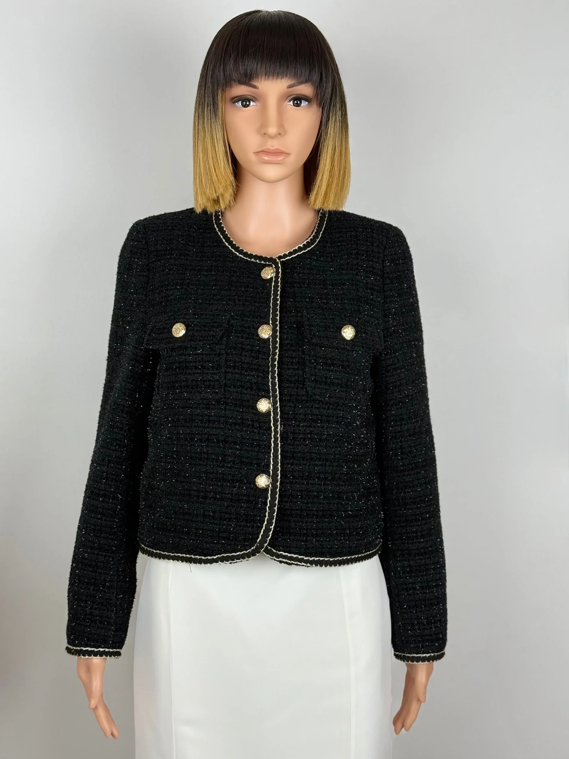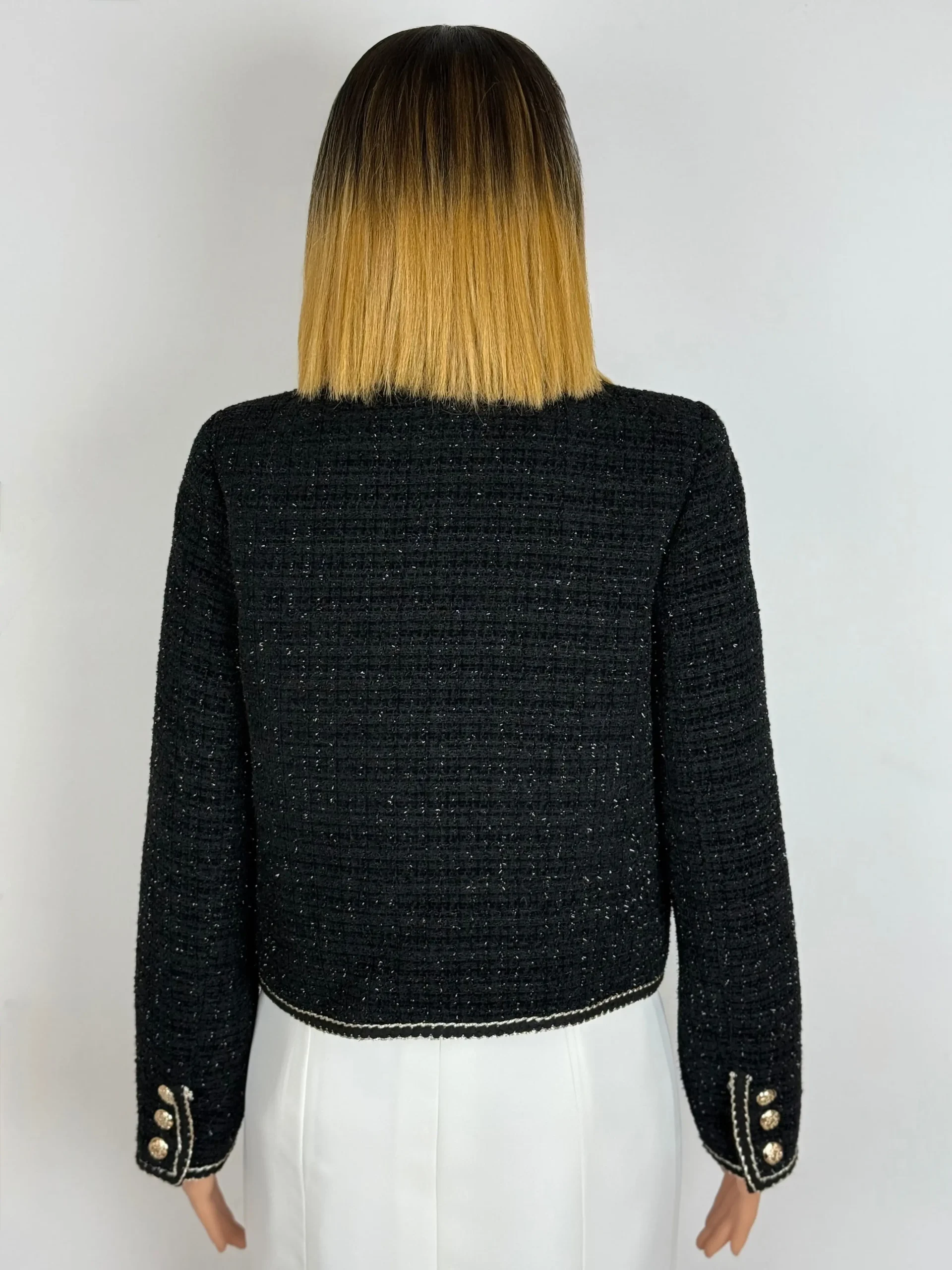 Veste courte en tweed noir tissé de fils délicatement irisés, agrémentée de galon écru et de boutons dorés gravés. Coupe droite, poches plaquées. Doublure satinée et finitions soignées. Une coupe minimaliste et intemporelle qui allie chic et modernité.